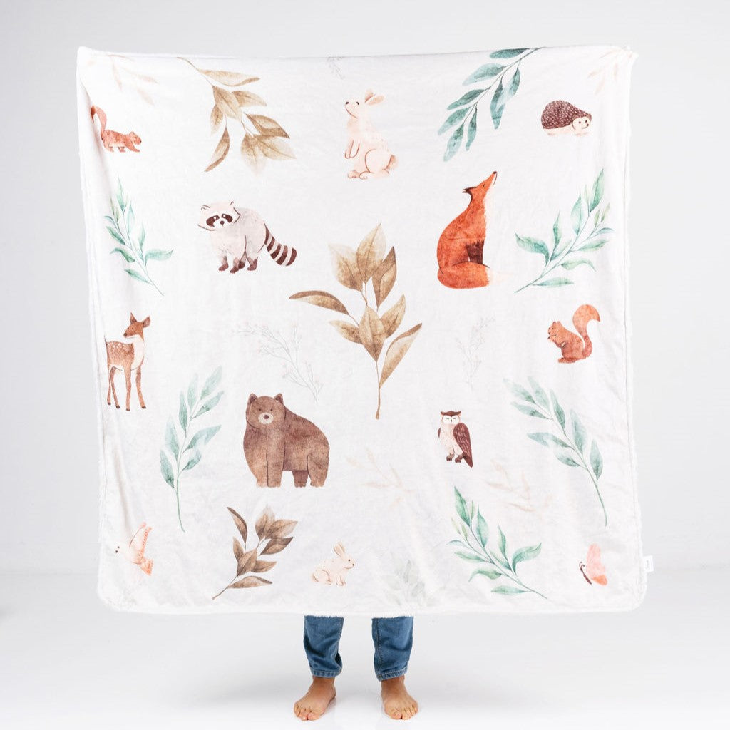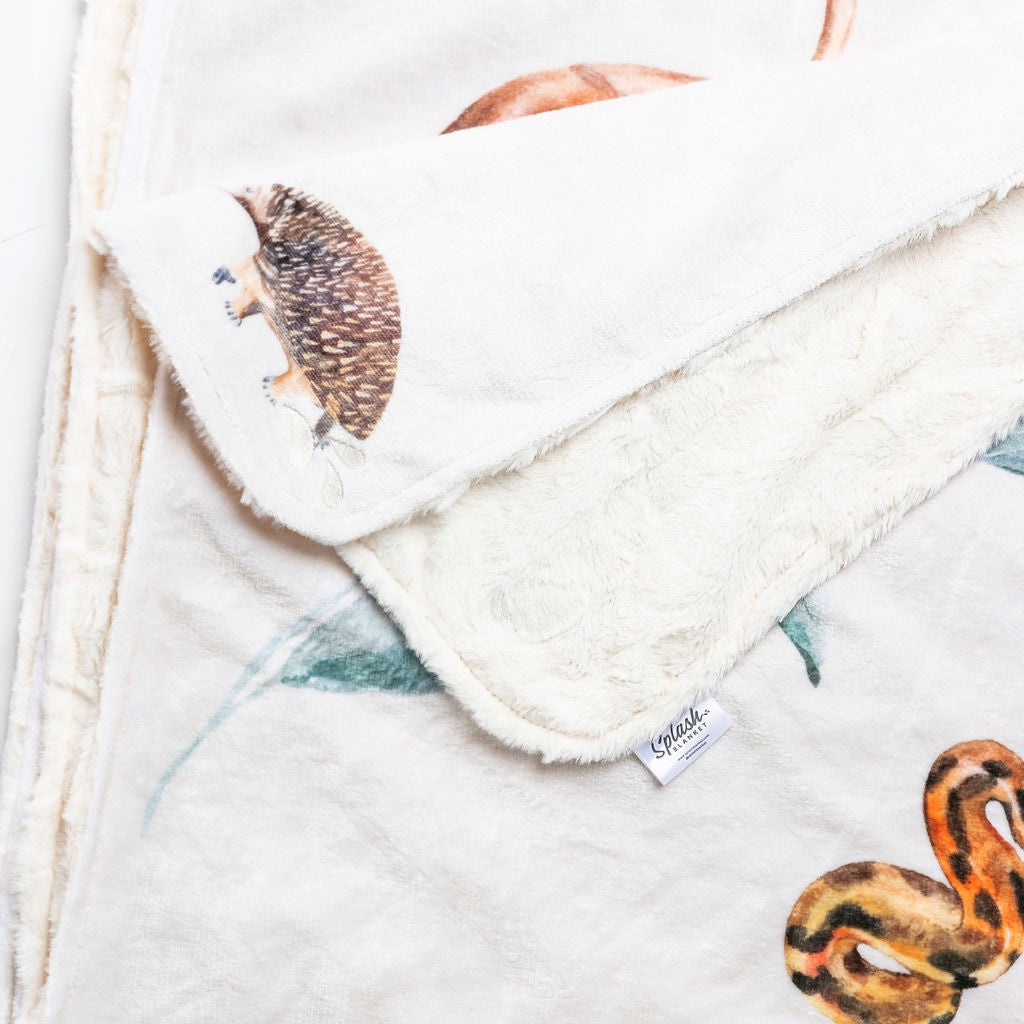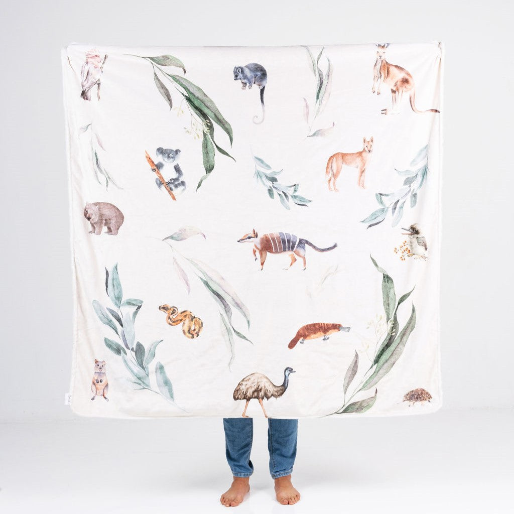 With a whimsical woodland or Aussie outback animals print on one side and soft cream faux fur on the other, this plush, waterproof blanket is perfect for lounging, picnics, messy moments, or cosy nights in.
