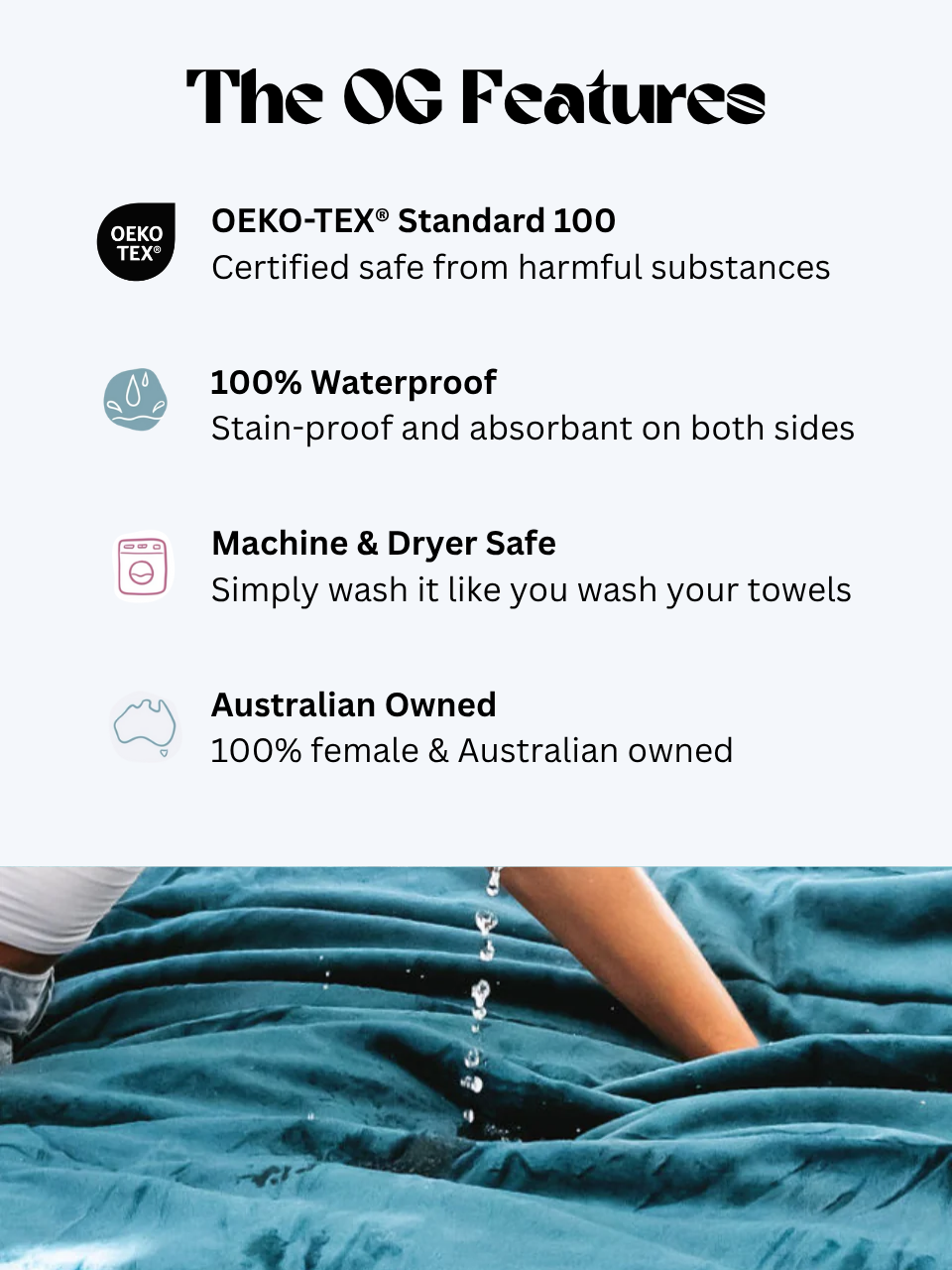 The OG blanket is thick, plush, cosy and completely waterproof on both sides. One side features our signature smooth micro-velvet fabric and the other side has fluffy sherpa fleece; the ultimate throw for soaking up big spills. Considered the most absorbent of all Splash Blanket styles, the OG is also ultra warm, snuggly and can hold up to a litre of liquid.