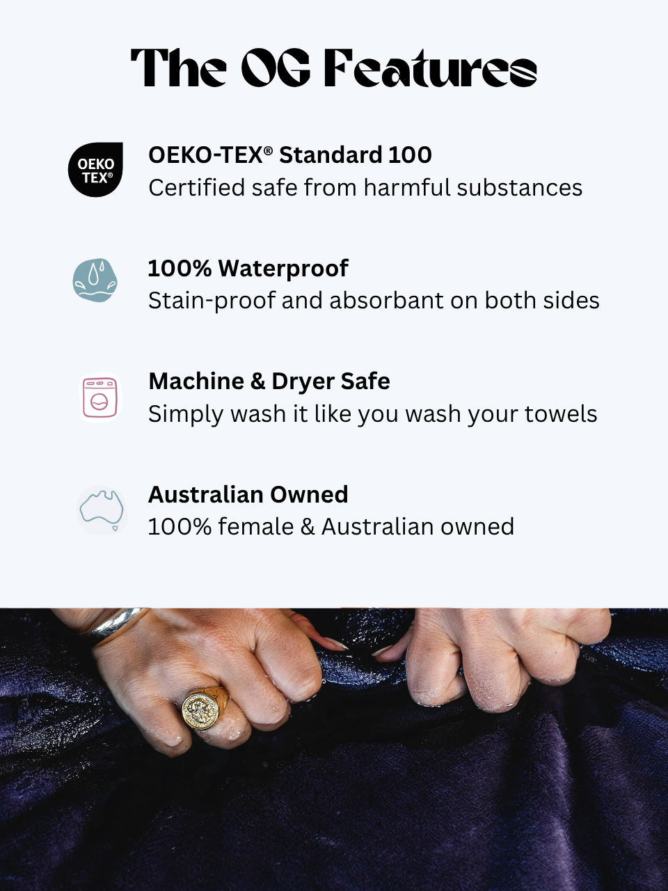 The OG blanket is thick, plush, cosy and completely waterproof on both sides. One side features our signature smooth micro-velvet fabric and the other side has fluffy sherpa fleece; the ultimate throw for soaking up big spills. Considered the most absorbent of all Splash Blanket styles, the OG is also ultra warm, snuggly and can hold up to a litre of liquid.