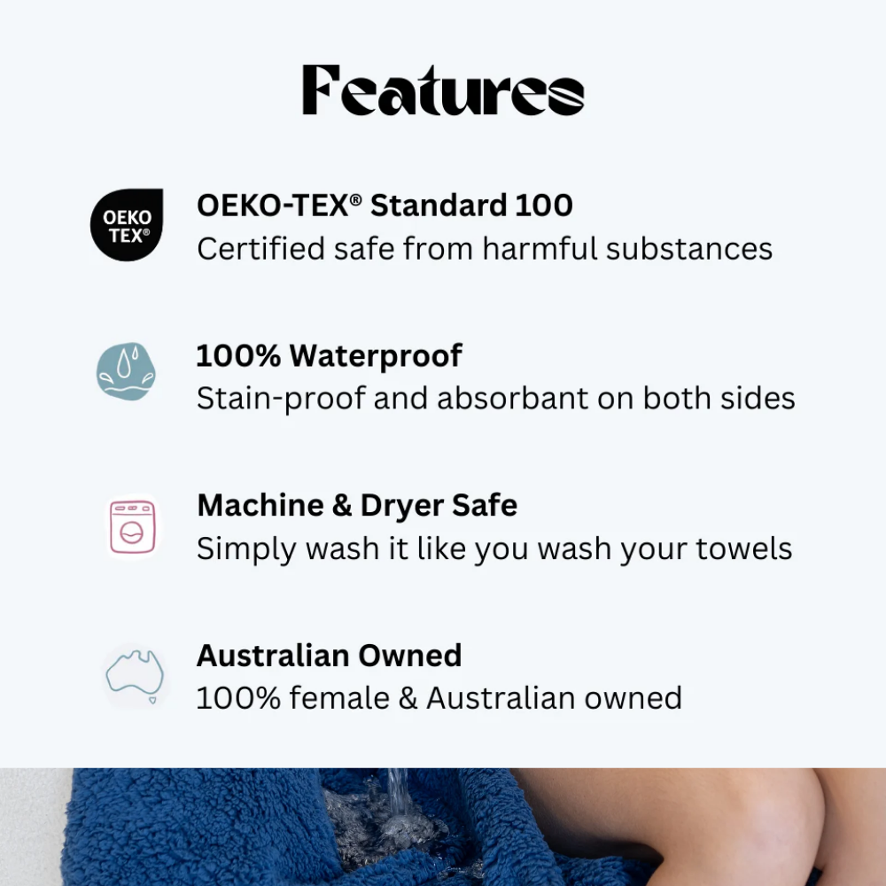 Splash Blankets are bonded* with a waterproof internal layer making it waterproof and absorbent on both sides. The waterproof layer is made of 100% recycled Thermoplastic Polyurethane (TPU), which makes both sides of the blanket waterproof and absorbent.
